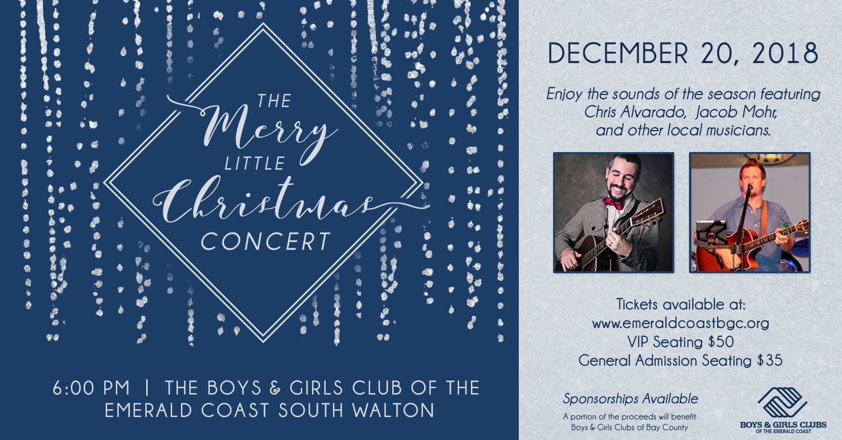“This concert is the perfect event to celebrate the holiday season,” said Shervin Rassa of the Boys & Girls Clubs of the Emerald Coast. “The artists we’ve lined up are local favorites, and I’m excited to hear their versions of Christmas classics.”