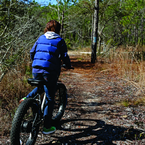 Jason and Emily Medina run Pedego 30A, and they had just invested in four new fat-tire bikes to go off-roading on trails in Grayton Beach State Park and Point Washington State Forest. Working with the Choctawhatchee Basin Alliance (CBA), they designed a map based on the- tire bike rental back to CBA as a recurring gift. Alison McDowell, Director of CBA, and I had arrived to take one final spin around the mapped route with Jason and his team before the maps went public.