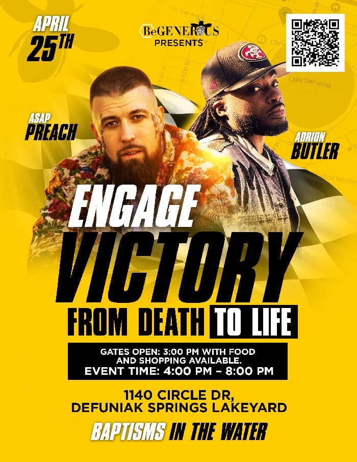 BeGenerous is honored to announce the 6th Annual EnGage outreach will take place Saturday, April 25, 2026, from 4 to 8 p.m. at the Lakeyard Amphitheater, 1140 Circle Drive, DeFuniak Springs. It’s an evening centered around Jesus and a community declaring hope over heartbreak, life over death, and freedom over addiction. This night is dedicated to honoring those we have lost, loving those who are still struggling, and supporting and educating the generations to come.