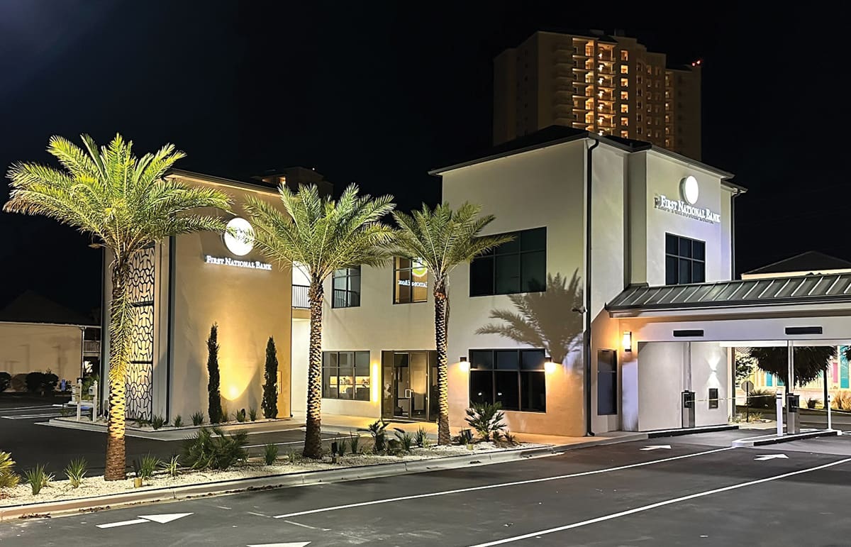 First National Bank stands in the heart of Miramar Beach, just across from Chick-fil-A, and is a beacon of true community banking. It’s a welcoming financial center by day, but as night falls, the lights come alive, casting a mesmerizing display of colors across the landscape. These vibrant lights mirror our community’s dynamic spirit and remind us of our unwavering commitment to serving you, our valued customers, and this blessed place we call home.