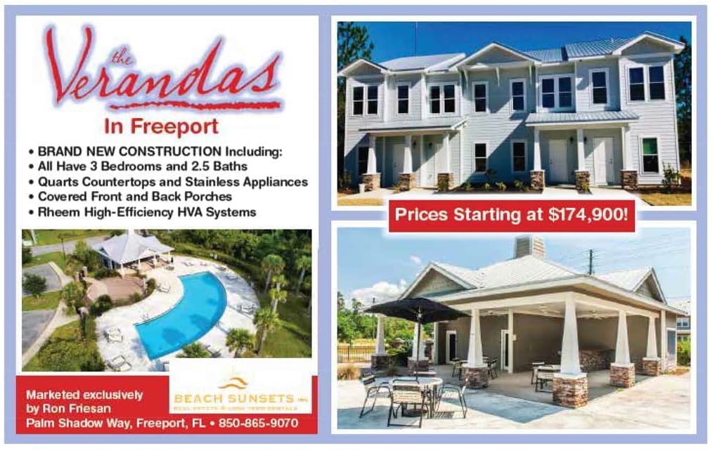 The main limiting factor for Walton County’s continued growth is both infrastructure and affordable housing. With this in mind there are several projects in Freeport now that are addressing this need.  One of them is the revitalized 40+ acre multi-family community the Verandas in Freeport. Just off of Hwy 331 near schools, the Verandas subdivision has answered this need for affordable housing, but is also offering the quality. A beautiful pool with amenities and large community yards across the street from Freeport Elementary School are a few of the many features of this beautiful subdivision.