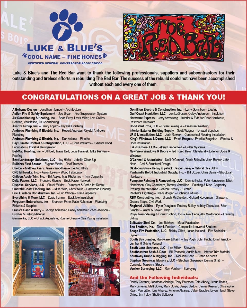 Well thank goodness they did, and after the fire destroyed the beloved Red Bar in February of 2019, many contractors came knocking. What made Luke & Blue’s Construction so special? Deron says, “I live very close and have been a patron of The Red Bar for 15 years, you can’t get more local than that. I truly care about my clients and always want them to be satisfied. For me, I took a sense of ownership and pride because I live here and The Red Bar is the cornerstone of our Grayton / 30A community. I was happy that I could monitor progress very easily, even on the weekends.” He goes on to say, “It was truly a team effort and none of this could have been possible without our many Luke & Blue’s sub contractors. They really stepped up to the plate and hit it out of the park! They deserve much of the credit.” You can say that again, once Luke & Blue’s received the building permit; it took only eight months to rebuild.