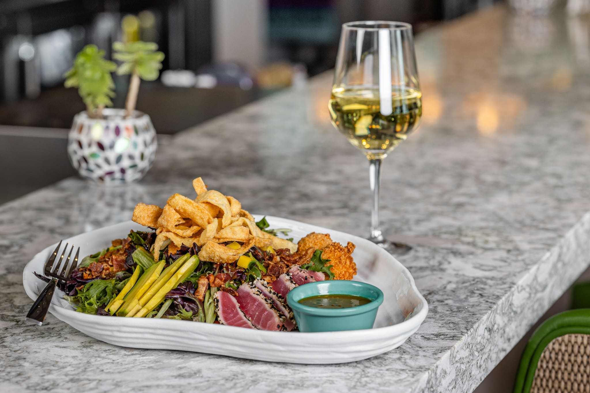 Blue Bar (2023) Web 28This establishment serves lunch and dinner daily, and with its central location and proximity to so many businesses, Blu is becoming the “It” meeting spot for business lunches and dinners, friend meetups, and social gatherings by the locals. Michelle started bringing out a succession of dishes from the Sharables, Hot Hands and Entrée menus. The stunning Emerald Tuna Crunch salad got our attention with its pepper-crusted, seared ahi tuna strips laid over baby greens, fresh mango, avocado, applewood smoked bacon, and topped with almonds, crispy wontons, and fried goat cheese with a splash of mango sesame vinaigrette. It was an aesthetic fusion of tastes, textures and temperatures, and that goat cheese was screaming with flavor! Now, our moms always claimed that a colorful plate is the most nutritious plate, and the Lemon and Herb Seared Salmon served alongside a sticky rice pilaf (reminiscent of veggie risotto) and freshly steamed, al dente broccolini is the epitome of this declaration. The salmon was prepared in a carrot-ginger butter and soy glaze, and the entire dish was emblazoned with bold, bright, colors.