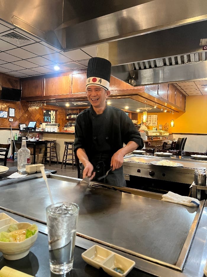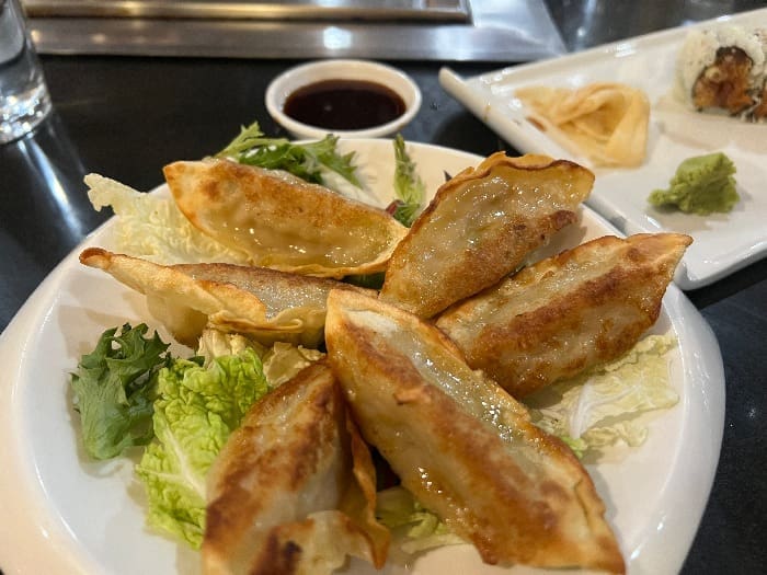Sherry, one of the owner’s daughters, warmly greeted my family as we entered. She guided us to one of the multiple hibachi grills and introduced us to VKI’s wide selection, recommending the shrimp tempura and pork gyoza as starters. We decided to try the pan-fried gyoza as well as an order of spicy tuna rolls as our appetizers, and since we had hibachi access, we all ordered food off the grill to see how the chef would perform: grilled chicken, scallops, shrimp, and filet mignon awaited us all that evening.